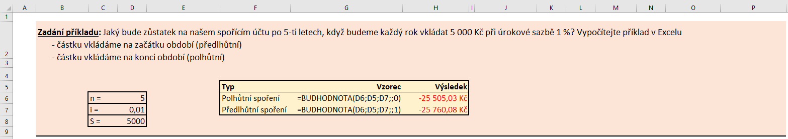 Zadání příkladu: Jaký bude zůstatek na našem spořícím účtu po 5-ti letech, když budeme každý rok vkládat 5 000 Kč při úrokové sazbě 1 %? Vypočítejte příklad v Excelu pro varianty: