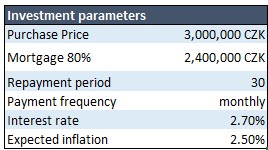 We are planning to realize a real estate investment in a district town—a panel apartment 3+1, 73 m2—for the purpose of renting and future sale (in 30 years). The purchase price of the property is 3,000,000 CZK. We will finance the property with a mortgage loan with 80% LTV (we must pay 20% from our own resources), a 30-year maturity, monthly repayment frequency, and an interest rate of 2.7%.