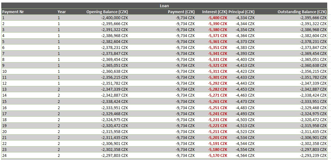 If we know the loan amount, repayment period, frequency, and interest rate, it’s not a problem to create an amortization schedule with 360 rows (30 years * 12). The annuity payment we will send to the bank every month is 9,734 CZK.