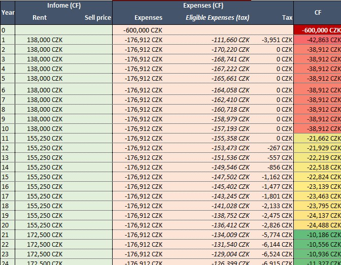- Investment Outlay – in year 0, we incur an investment of 600,000 CZK because the bank only covers 80% of the property price.
