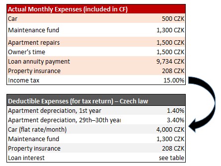 - Our real monthly costs will be 500 CZK for a car, 1,300 CZK for the repair fund, 1,500 CZK for the apartment repair reserve (set aside), 1,500 CZK for owner’s time, insurance, the annuity loan payment, and an annual 15% income tax.