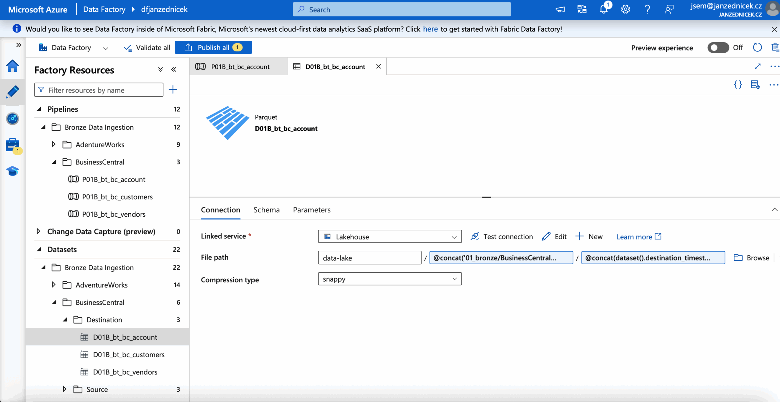 In our case, ADLS Gen2 is used purely as a layer for storing and backing up data. Fabric itself will read data from this storage and subsequently merge it into the Lakehouse.