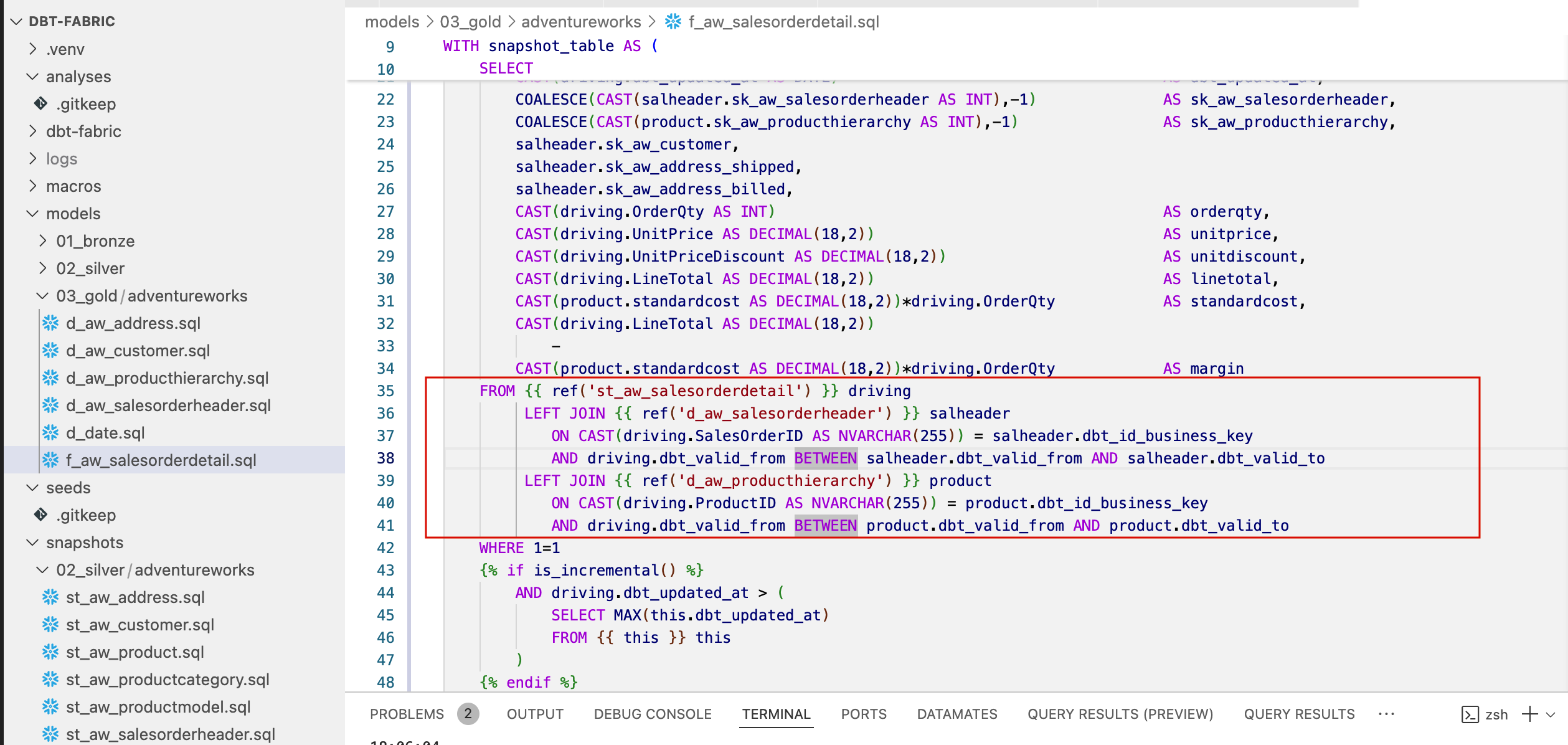 - Dependencies: Dependencies between models (e.g., a Silver model depending on a Bronze model, or interdependencies within Gold tables) are defined using the JINJA macro {{ ref(‘model_name’) }} as shown in the image below.