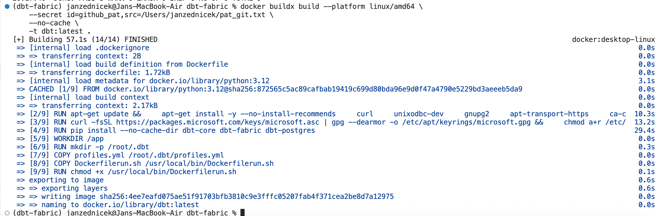 - Next, build the image by running the following command in the terminal. Secrets (GIT PAT and client secret for Fabric connection) will be passed later in Azure — embedding them in Docker is a security risk.