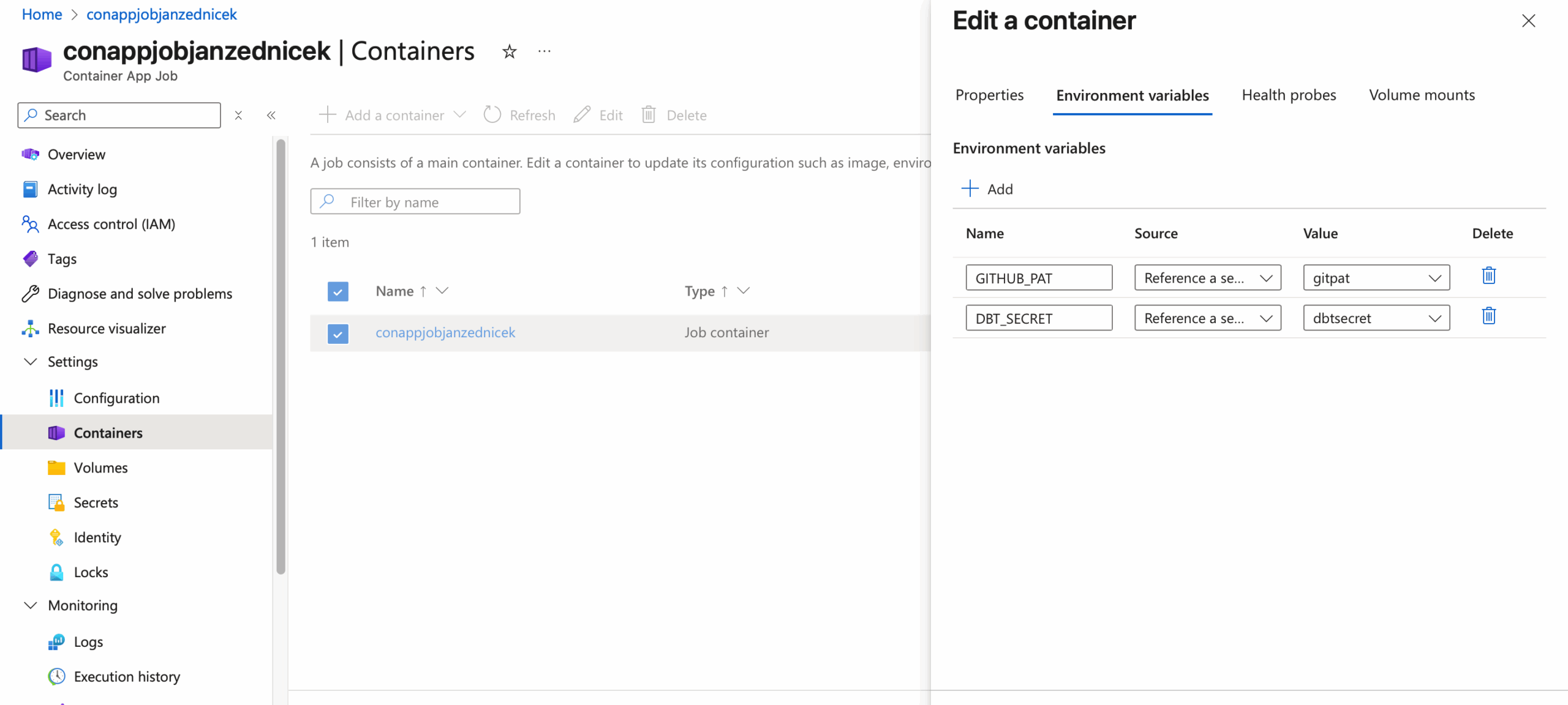 DBT_SECRETfor Fabric authentication andGITHUB_PATfor repository access before dbt runs. Each variable refers to a secret stored either in Container Secrets (Settings → Secrets) or Azure Key Vault. If using Key Vault, make sure proper access rights are configured.