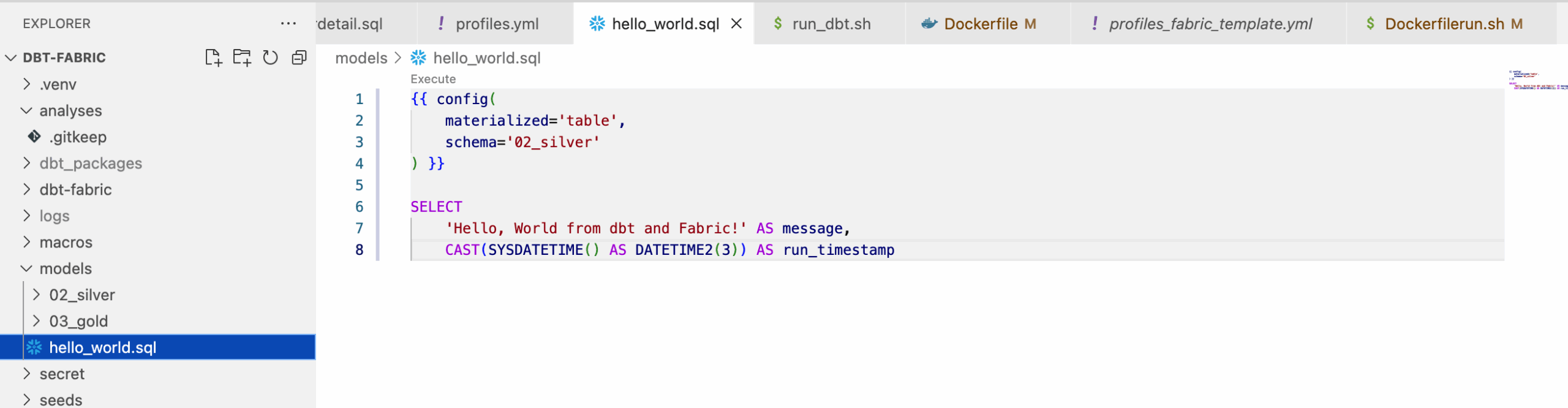 - Create a new file in the dbt project called Dockerfile (-> open to see script) – this defines what the container environment includes: Python, dbt adapters, ODBC Driver 18, and the definition of the run script.
