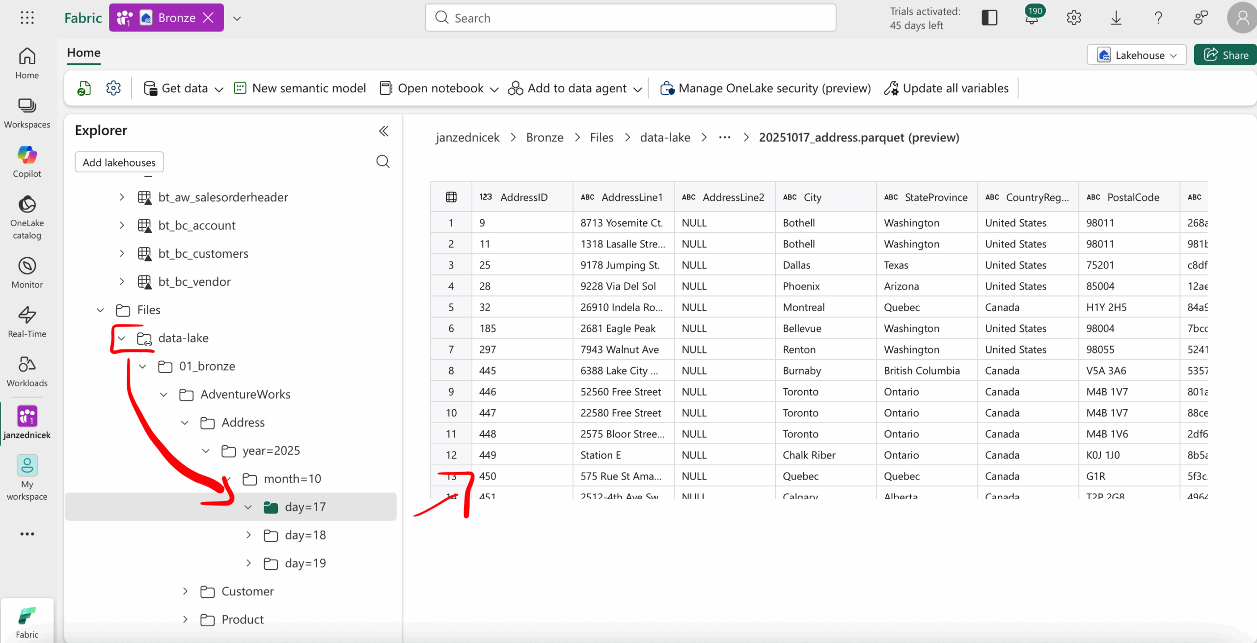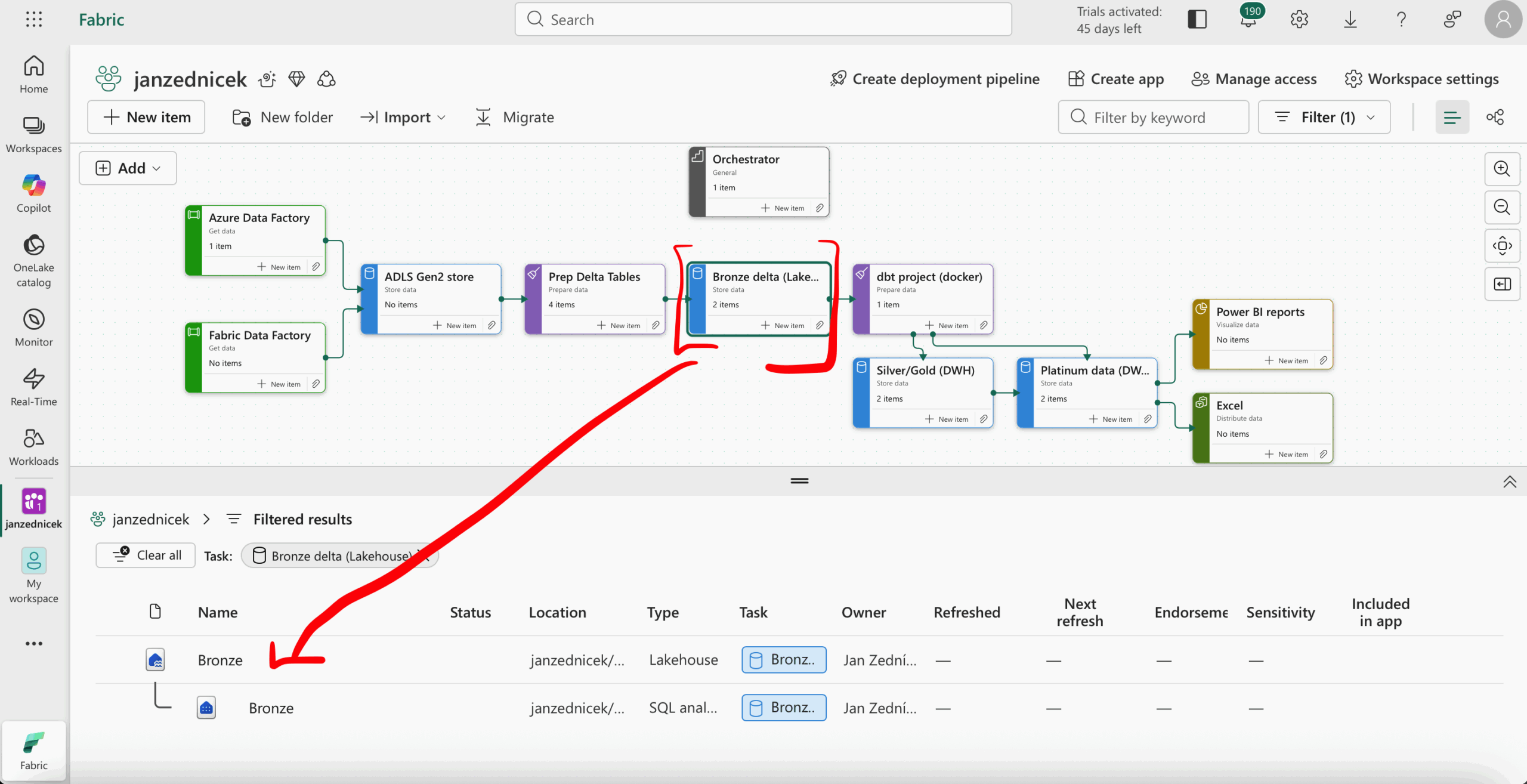 - Log in to Fabric – open your workspace and navigate via our convenient Task flow navigation to the Lakehouse artifact