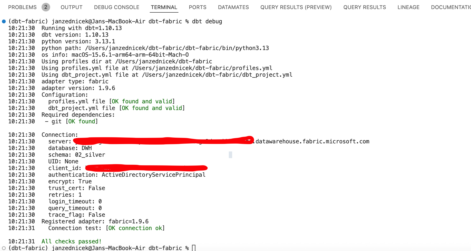 Správnost konfiguračního souboru profiles.yml a nastavení práv můžeme otestovat příkazem dbt debug v našem vývojovém prostředí nad dbt projektem (třeba Visual Studio Code)
