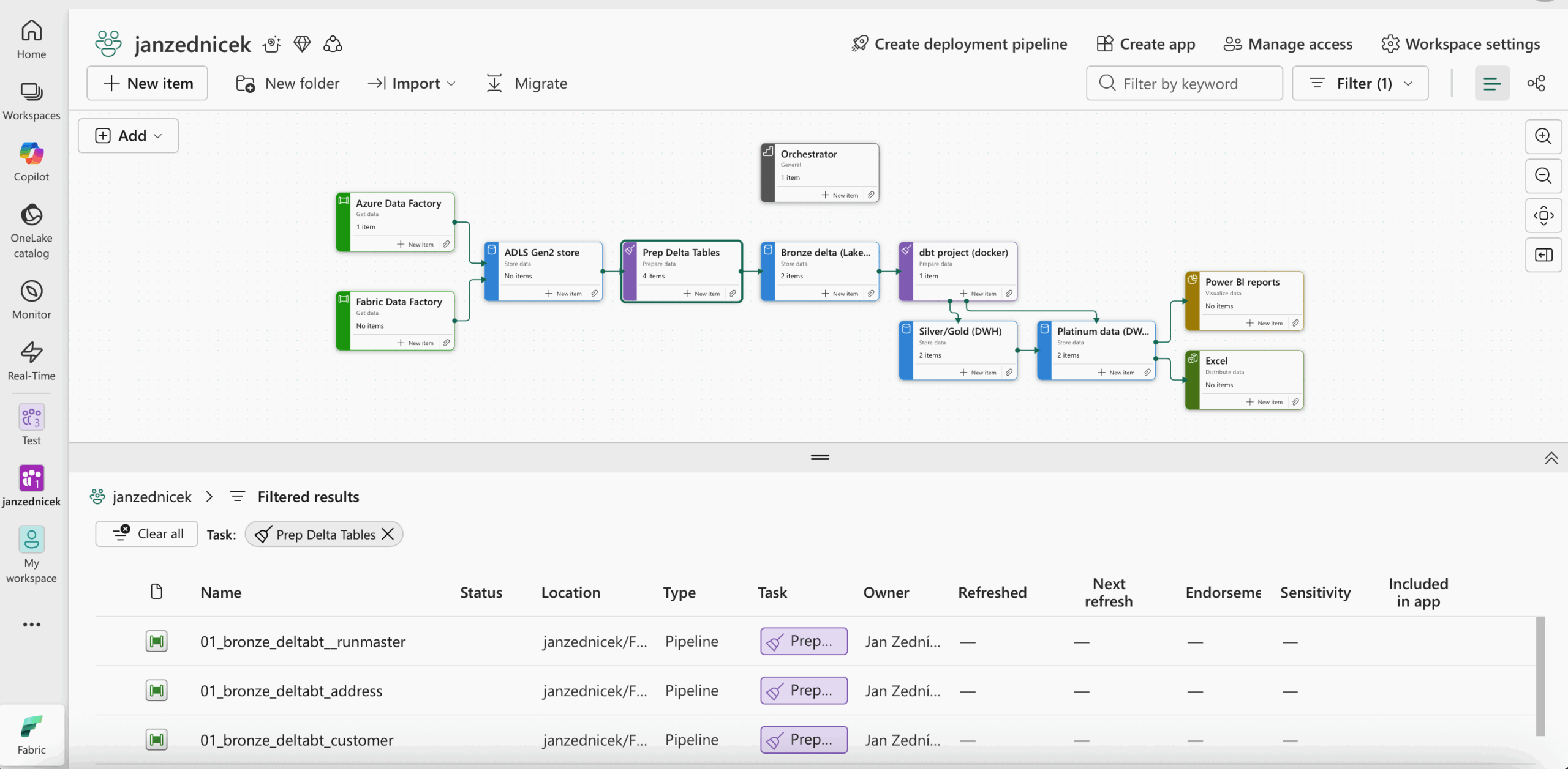 Workspace ve Fabricu funguje jako logická jednotka pro organizaci a správu všech datových artefaktů datového řešení v rámci workspacu (podobně jako workspace v Power BI) – např. pipelines, notebooky, lakehousy, warehousy, aj. Správná organizace workspaců v organizaci je důležitá zejména z hlediska pohodlné správy datového řešení a také efektivní organizace přístupových oprávnění.