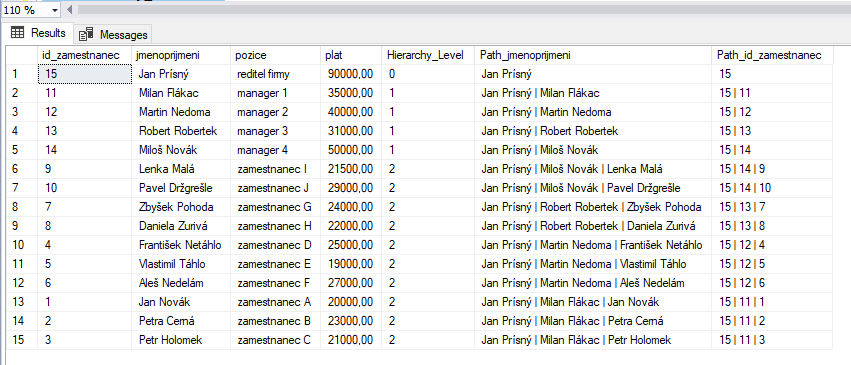 - Hierarchy_Level – zobrazení úrovně člena hierarchie. Ředitel má 0, manažer 1 a zaměstnanec 2. Pokud by měla hierarchie více členů, tak by bylo více levelů
