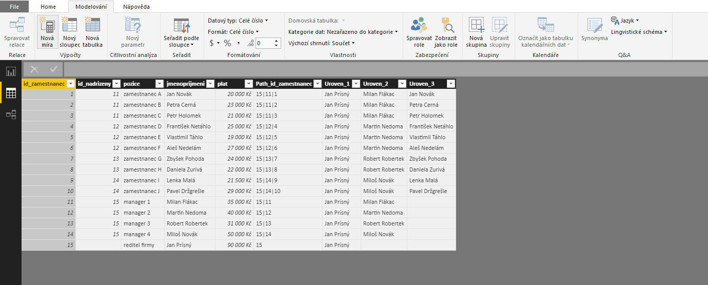 - Tuto cestu použijeme pro vytvoření dalších 3 sloupců (máme 3 úrovně hierarchie – ředitel, manažer, zaměstnanec). Pro úroveň 1 bude vzorec vypadat takto: Uroven_1 = LOOKUPVALUE(zamestnanci[jmenoprijmeni];zamestnanci[id_zamestnanec];VALUE(PATHITEM ( zamestnanci[Path_id_zamestnanec]; 1 )))