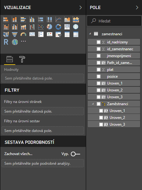 4) Na úrovni reportu vytvoříme nové pole s hierarchií – Zaměstnanci a sestavíme ho jako na obrázku níže: uroven_1 -> uroven_2 -> uroven_3