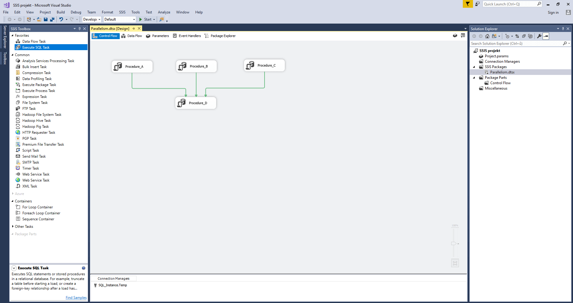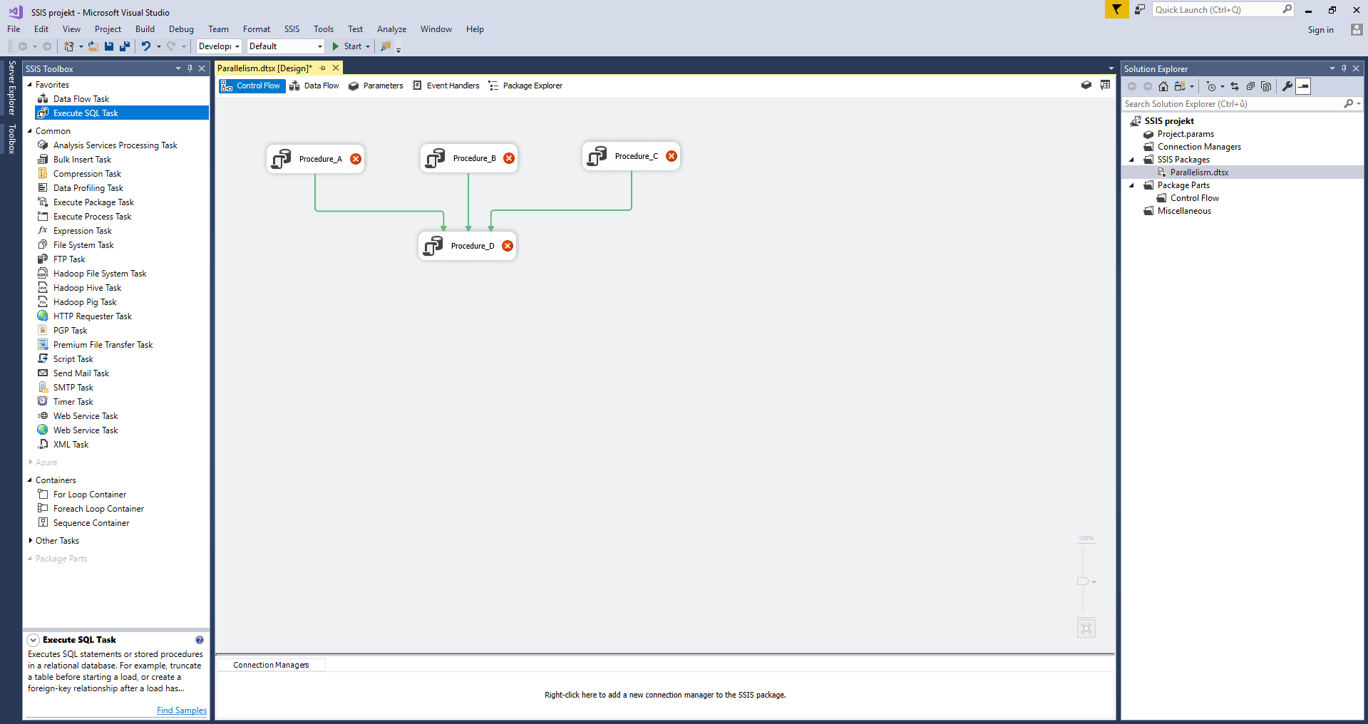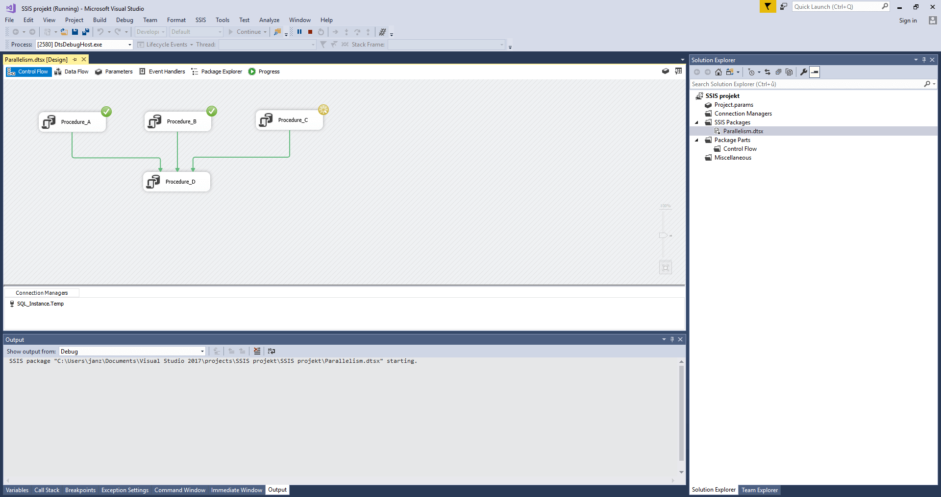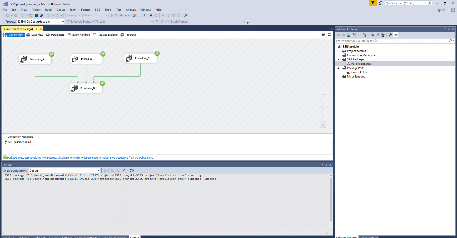 To znamená, že tasky jsou validní = funguje connection manager a SQL skripty jsou validní. SSIS package je připraven. Můžeme vyzkoušet, jestli paralelní zpracování dat funguje