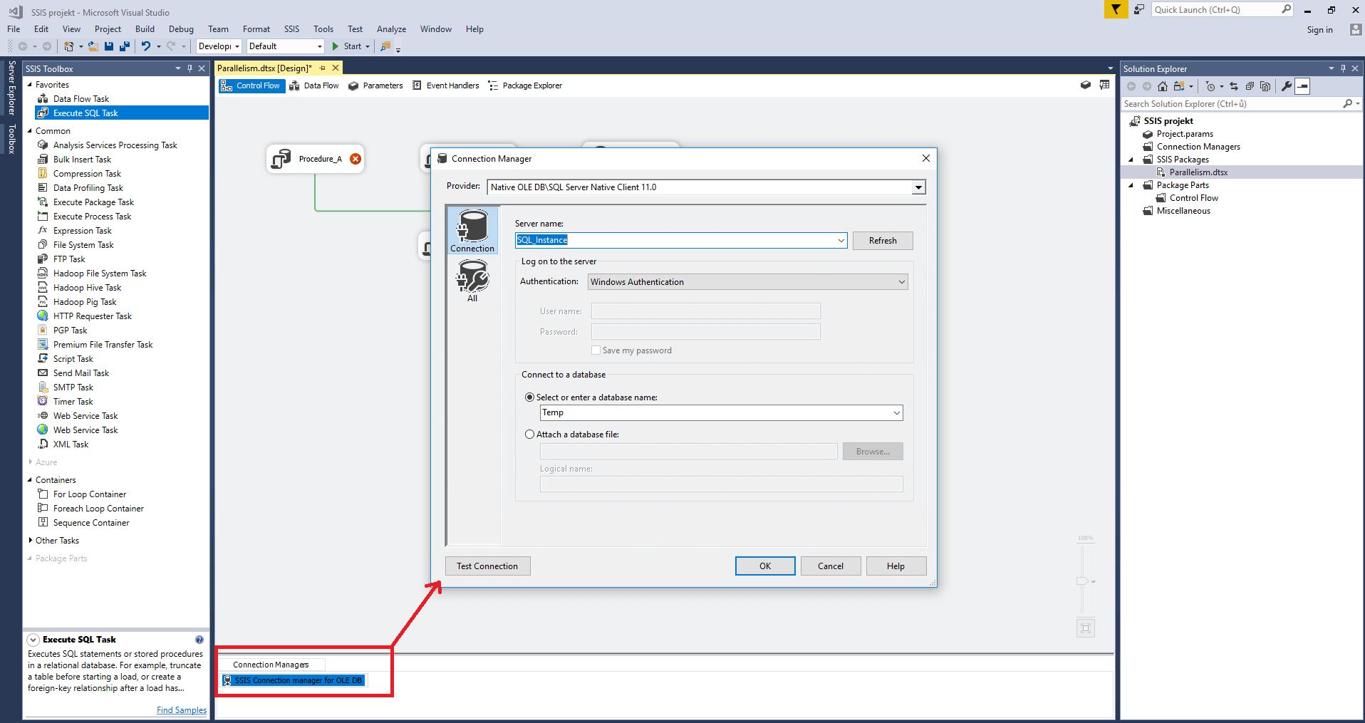 Nejdříve si musíme založit Connection managera na náš SQL server (viz. obrázek). Klikneme pravým tlačítkem do oblasti Connection managers – new OLE DB connection – Vyplníme název SQL Server instance a název databáze – následně potvrdíme OK