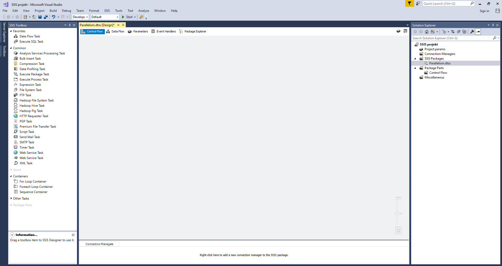 Založíme si prázdného SSIS projektu a package (balíčku)