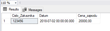 Pomocí funkce si zobrazíme sloupce – Cislo_zakaznika, Datum_registrace a Cena_zajezdu
