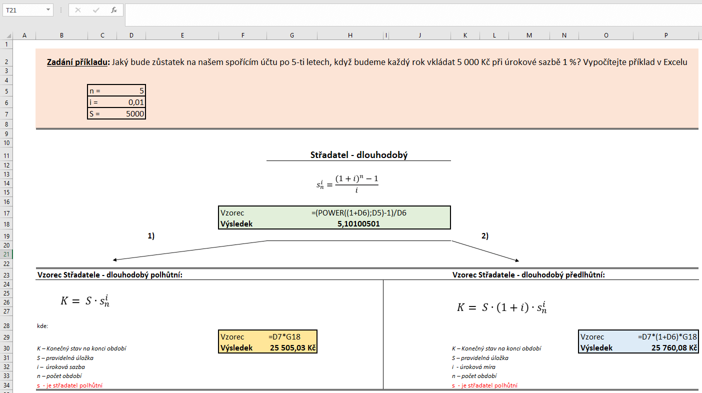 Obecný vzorec pro střadatele vyjadřuje, kolikatinásobek pravidelně ukládané částky budeme na konci období mít v případě dlouhodobého polhůtního spoření. Spoření je typicky dlouhodobý produkt a proto se v příkladech zaměříme pouze na dlouhodobou variantu předlhůtní a polhůtní. V obou těchto variantách použijeme základní vzorec pro výpočet střadatele. Výsledek bude přehledně ukázán v excelu. Nejprve ale vzorce: